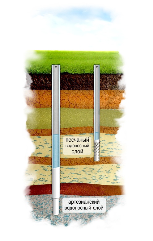 Песчаный водоносные слои могут располагаться на разных глубинах от 5 до 100 м, в зависимости от этого бурят скважины на первый песок или на глубокий песок.